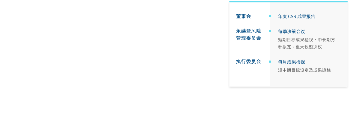 hth·华体成立永续委员会(2023年更名可持续暨风险管理委员会),作为公司永续发展运作的最高治理机构,并持续策化推动企业永续转型,透过永续长及永续专责单位,统筹中长期永续发展的策略方向。